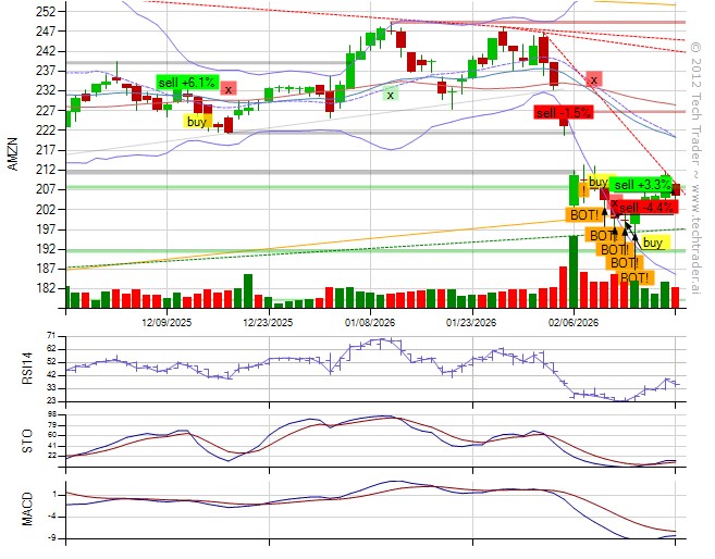 From @Grok (API): "Exit long to cash as AMZN drops back to 204.88 failing to sustain rebound above 210 amid lingering AI capex fears, bearish MACD, and price below EMAs signaling weakening momentum."