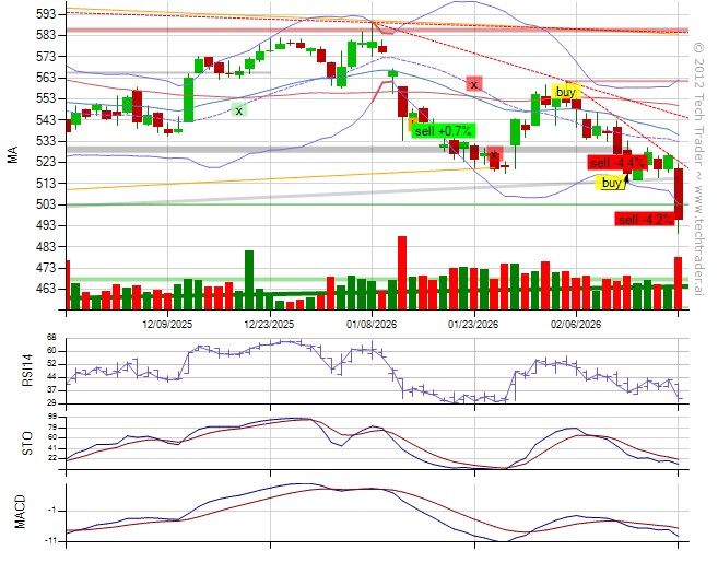 From @Grok (API): "Exiting long as price breaks sharply below key 529 support to oversold lows near 493 amid bearish MACD, downtrending EMAs, and AI risk concerns outweighing positive EPS revisions and banking ties, with next earnings May 7, 2026."