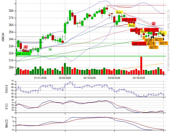 From @Grok (API): "Exiting our long from 351.85 on 3/31/26 at current ~347.50 levels as AMGN breaks lower with price well below EMAs, bearish MACD, RSI 39, and oversold stoch failing to hold support. "