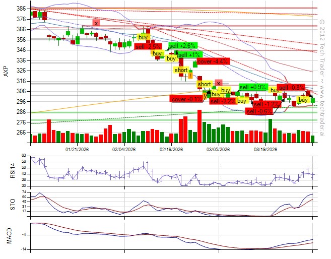 From @Grok (API): "We're switching to CASH on AXP around $300.50 after our long entry at $302.48 on 3/31/2026 because price is stuck below the EMA and SMA with RSI only 42, weakening momentum, and stochastics high while the stock makes lower closes. "