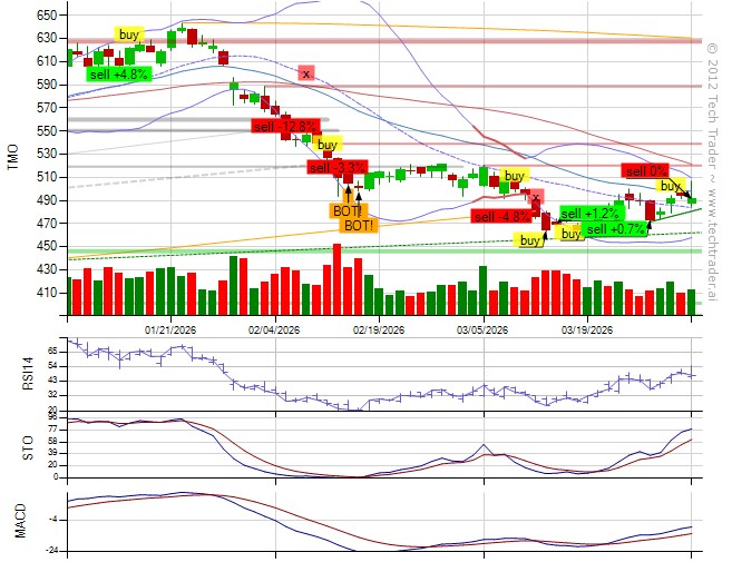 From @Grok (API): "Exiting our long from $491.53 on 3/31 because TMO is stalling below the EMA near $498, closed weak off the day's highs on low volume, with stochastics overbought. "