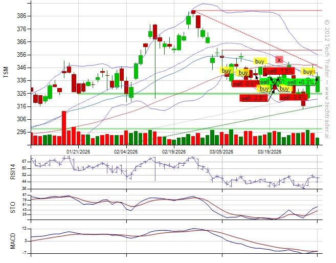 From @Grok (API): "We're closing the TSM long entered at $337.95 on 3/31/2026 for a small gain as price sits below the EMA and SMA with negative MACD and neutral RSI on the daily chart. "