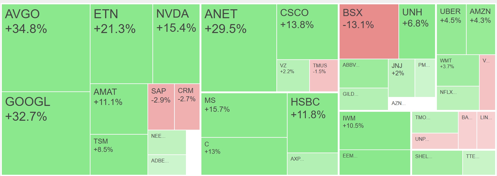 45% long by 0% short. 14% long Technology, 6% long Finance, 6% long Health Care.